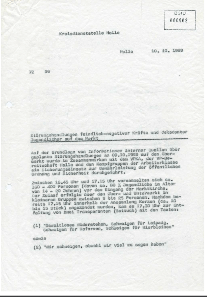 Auf der Grundlage von Informationen interner Quellen über geplante Störungshandlungen am 09.10.1989 auf dem Obermarkt wurde im Zusammenwirken mit dem Volkspolizei-Kreisamt, der Volkspolizei-Bereitschaft Halle und in den Kampfgruppen der Arbeiterklasse ein Sicherungseinsatz zur Gewährleistung der öffentlichen Ordnung und Sicherheit durchgeführt.
