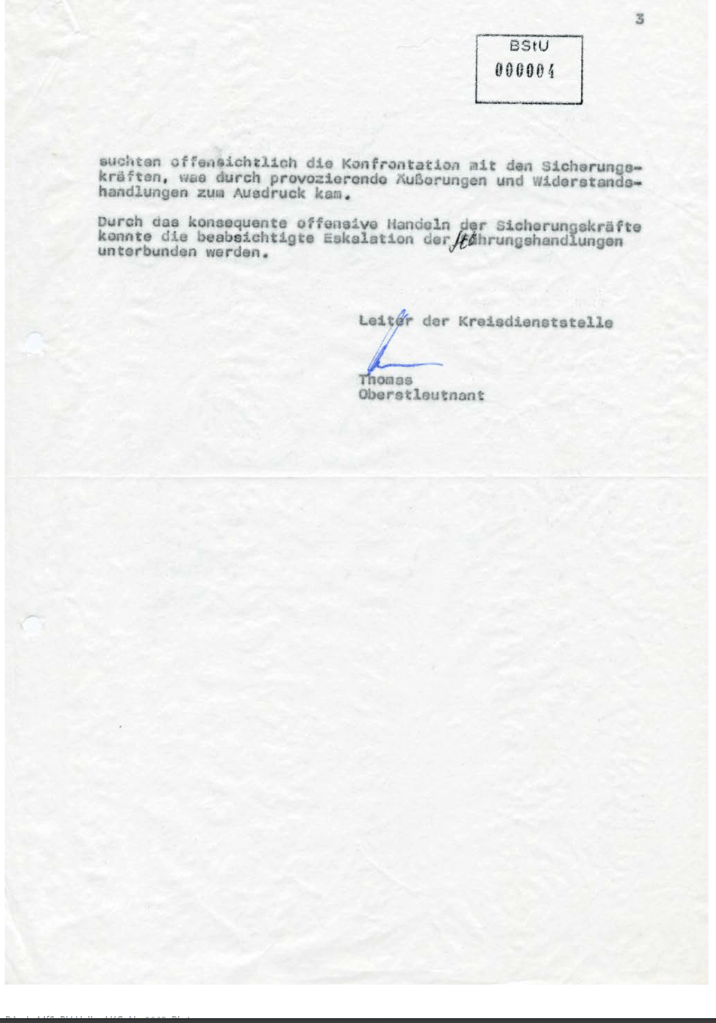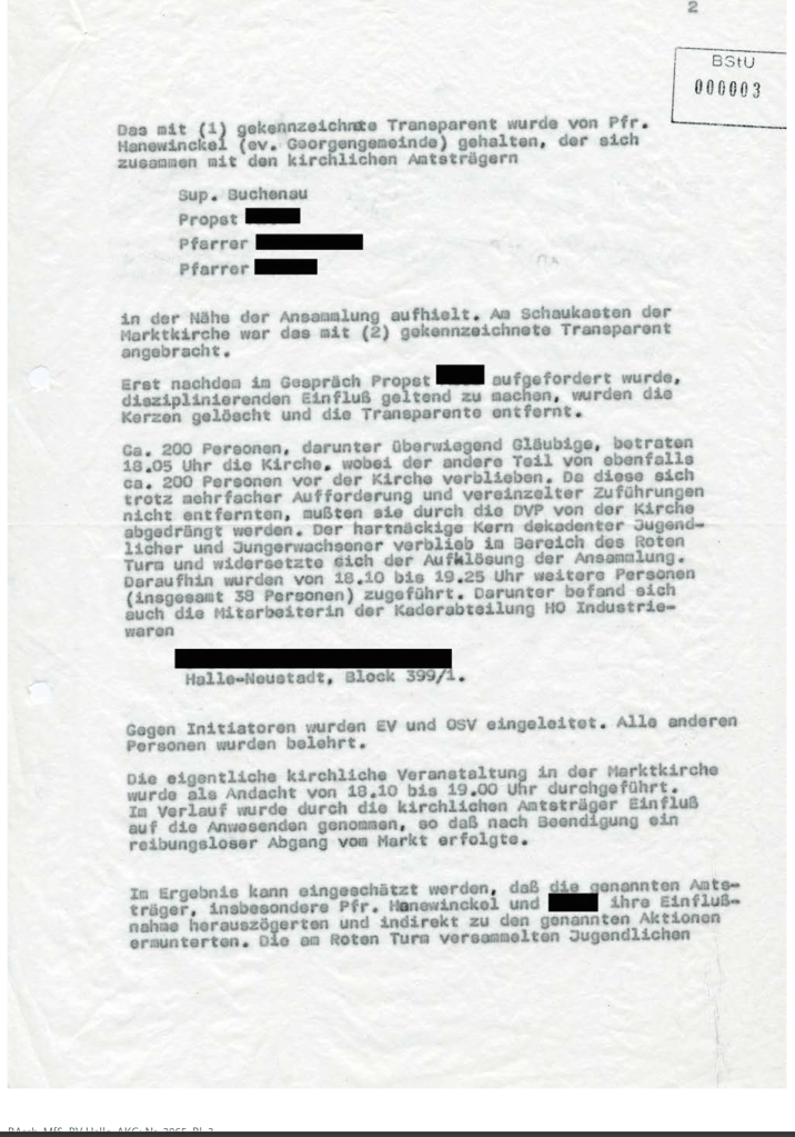 Im Ergebnis konnte eingeschätzt werden, dass die genannten Amtsträger, insbesondere Pfr. Hanewinckel und (Name unkenntlich gemacht) ihre Einflussnahme herauszögerten und indirekt zu den genannten Aktionen ermunterten. Die am Roten Turm versammelten Jugendlichen suchten offensichtlich die Konfrontation mit den Sicherungskräften, was durch provozierende Äußerungen und Widerstandshandlungen zum Ausdruck kam. (Krawallmacher hatten die Situation ausgenutzt. Das MfS hatte sie Leute überbewertet. P.R.)