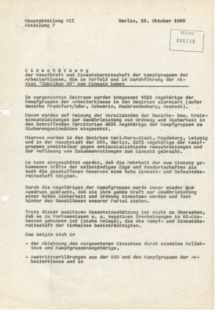 Einschätzung des MfS zur Kampfkraft und Einsatzbereitschaft der Kampfgruppen der Arbeiterklasse vom 23.10.1989, die im Vorfeld und Durchführung der Aktion „Jubiläum 40“ zum Einsatz kamen (Auszug)