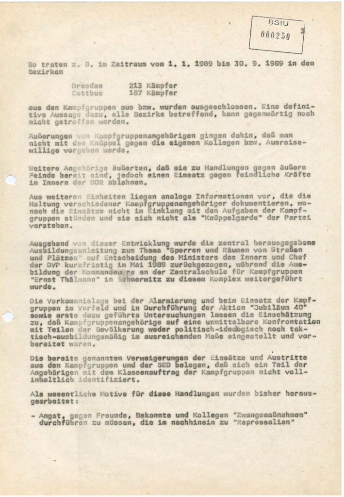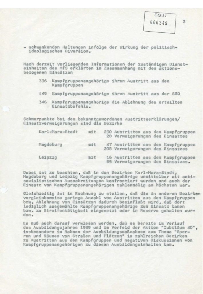 Es muss darauf verwiesen werden, dass es bereits im Verlauf des Ausbildungsjahres 1989 und im Vorfeld der Aktion „Jubiläum 40“, insbesondere im Rahmen der Ausbildungsmaßnahmen zum Thema „Sperren und Räumen von Straßen und Plätzen“ in zahlreichen Bezirken zu Austritten aus den Kampfgruppen und negativen Diskussionen von Kampfgruppenangehörigen zu diesen Ausbildungsinhalten kam.