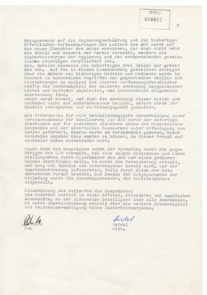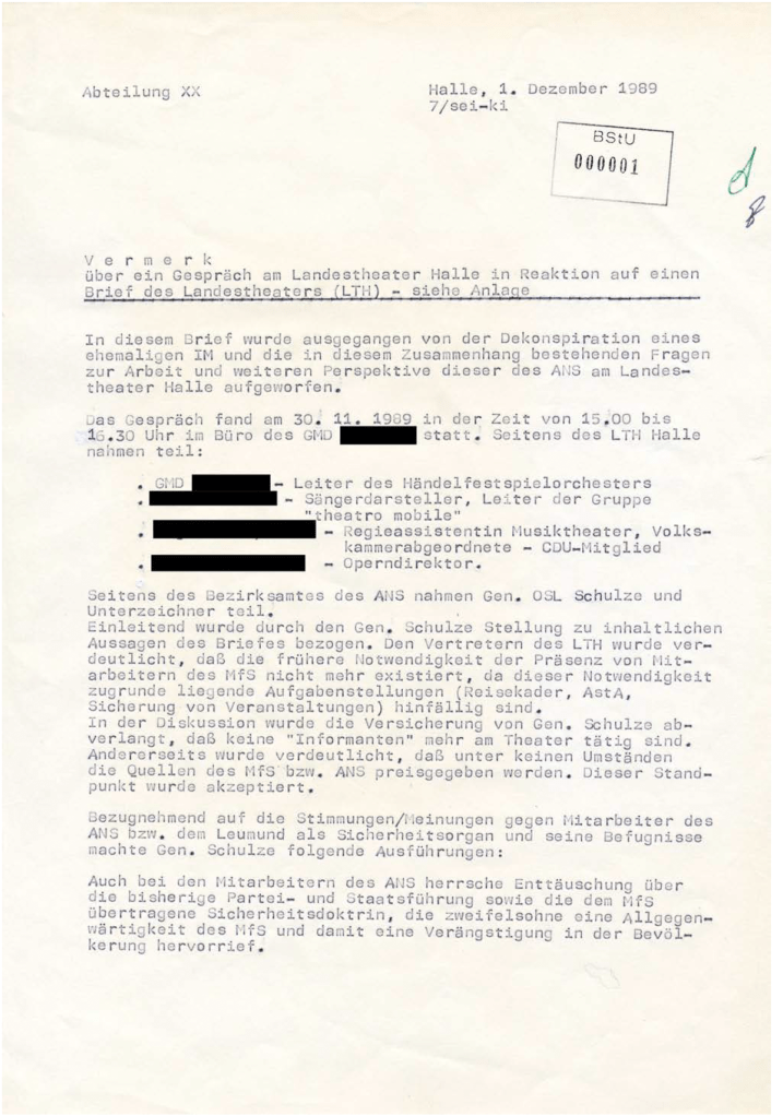 Einleitend bezog der Mitarbeiter des AfNS zum Inhalt des Briefes Stellung. Den Vertretern des Landestheaters Halle wurde erklärt, dass die frühere Notwendigkeit der Präsenz von Mitarbeitern des MfS nicht mehr existiert, da sich die Aufgabenstellungen verändert haben, bzw. hinfällig sind.