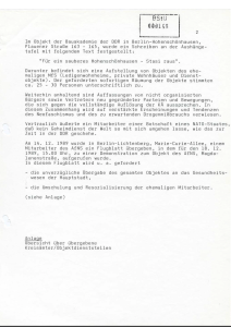 Darunter befindet sich eine Aufstellung von Objekten des ehemaligen MfS (Ledigenwohnheime, private Wohnhäuser und Dienstobjekte). Der geforderten Räumung der Objekte stimmten ca. 20 – 30 Personen unterschriftlich zu.