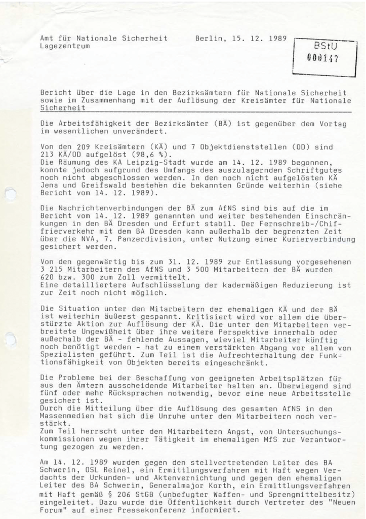Am 14.12.1989 wurde in Berlin-Lichtenberg, Marie-Curie-Allee, einem Mitarbeiter des AfNS ein Flugblatt übergeben, in dem für den 18.12.1989, 15:00 Uhr, zu einer Demonstration zum Objekt des AfNS, Magdalenenstraße, aufgerufen wurde.